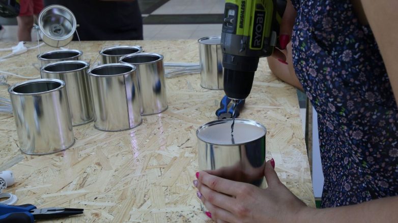 С помощью веревок, точно на середине банки, назначьте место на два отверстия (напротив друг друга, справа и слева от коробки). При помощи дрели-шуруповерта осторожно просверлите небольшие отверстия. С помощью винтов прикрепите подставку для банки, то есть ножки, приготовленные ранее с вешалки или проволоки.