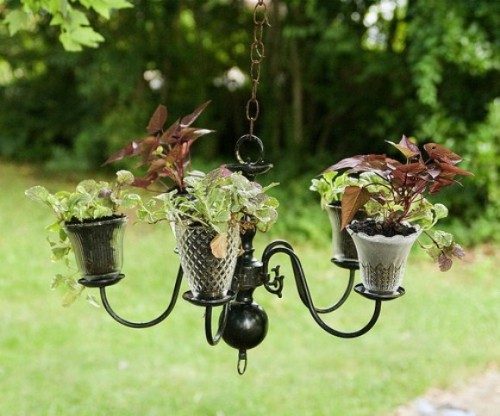 Если старый добрый и любимый канделябр нельзя реанимировать, постарайтесь использовать его по-новому.Например, из старой люстры вполне успешно можно сделать кашпо для цветов на дачу. Для этого поместите лампочки и абажуры в защитные цветочные горшки, наполните их землей и посадите цветущие растения. Такой дизайн может украсить открытую террасу загородного дома или балкон.