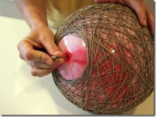 Проколите шарик и удалите его из получившегося абажура.Новый абажур можно украсить яркими бусинами, бантиками и бахромой.
