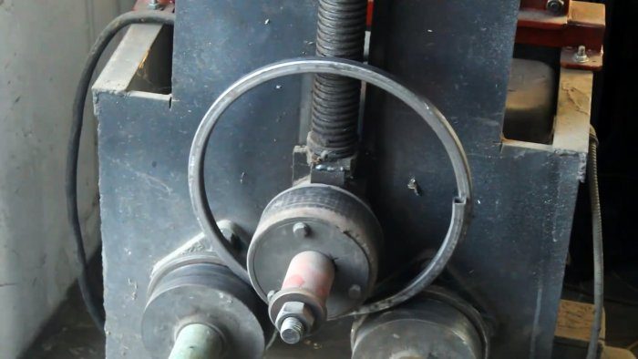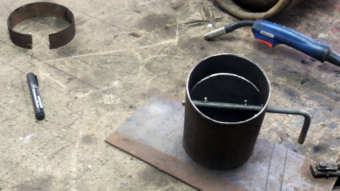 Далее нужно взять отрезок трубы 100 мм, просверлить ее, и вставить в отверстия Г-образный пруток. К нему приваривается вырезанная окружность.