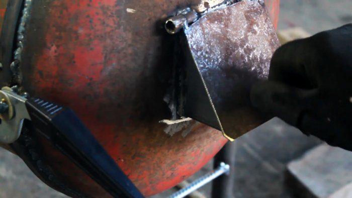 Из профильной трубы 100х100 мм вырезается скошенная заготовка. Ее нужно вварить в ранее отрезанный верх баллона, в котором предварительно вырезается окно. Полученная дверца приваривается к кольцу с асбестовым шнуром.