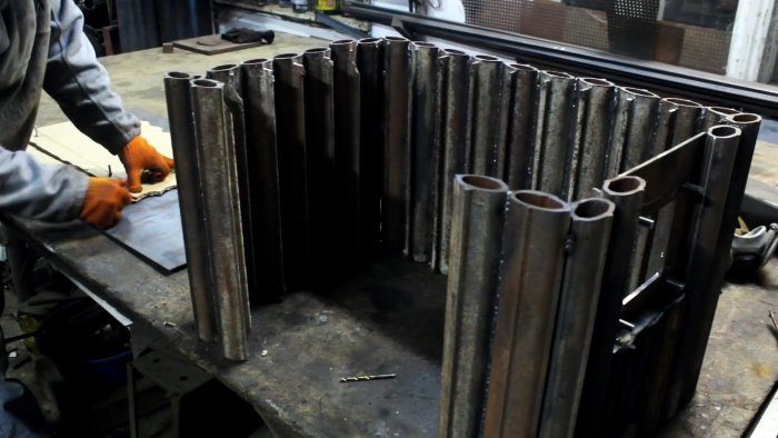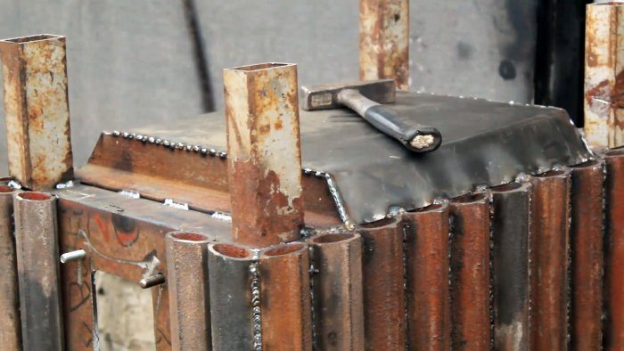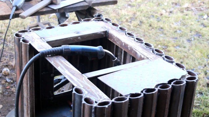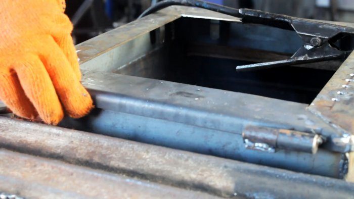 Задняя стенка и боковина свариваются вместе на ровном основании. В качестве передней используется две вставки по краям. Нужно оставить большой открытый проем, чтобы сделать смотровую дверцу.