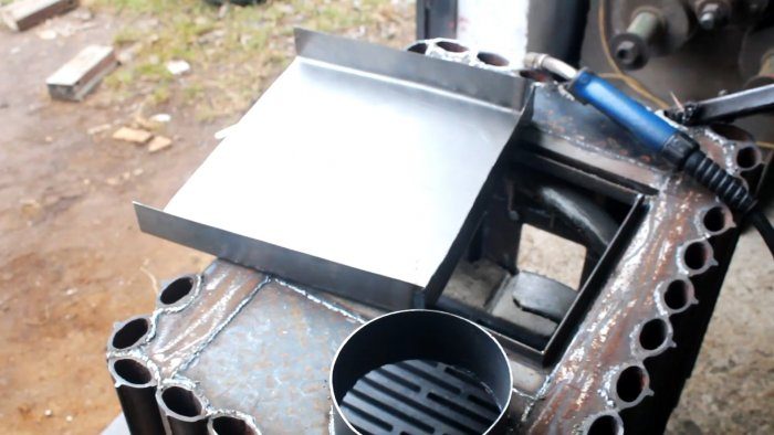 На проем вверху плиты изнутри ввариваются подкладки, чтобы устанавливаться плиту для готовки. Немного в стороне у задней стенки на предварительно вырезанное круглое отверстие приваривается фланец для подключения дымохода.