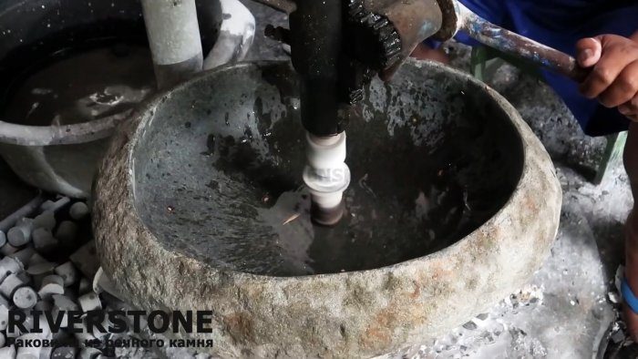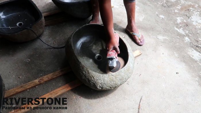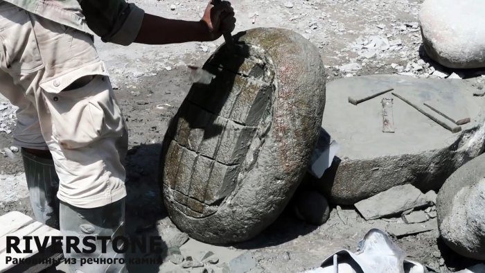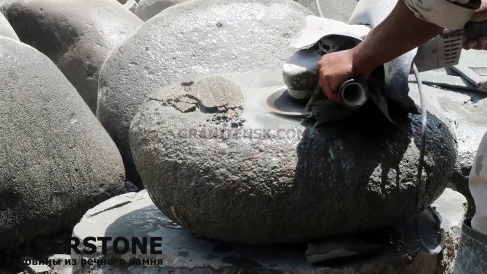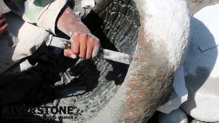 У отобранного валуна достаточной ширины необходимо подровнять плоскую сторону, чтобы сделать дно раковины, которым она будет стоять на столешнице. Для этого используется большая болгарка с алмазным диском по камню. Чтобы тот быстро не стерся, и не было пыли, инструмент потребуется доработать. Корпус болгарки нужно защитить резиновым экраном из автомобильной камеры, и вывести к защитному кожуху шланг с водой. Камень режется по кругу. После подрезка нарезается на пластинки, которые потом скалывается молотком и долотом.
