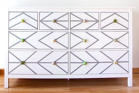Поэкспериментируйте с геометрическим дизайном, раскладывая клейкие полоски на лицевой части комода.