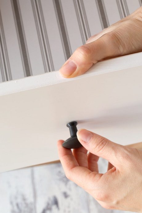 Шаг 1:Удалите все ручки с комода. Даже, если Вы не хотите менять фурнитуру, это даст возможность создать свой геометрический дизайн на ровной поверхности. И значительно облегчит применение клеящейся бумаги.