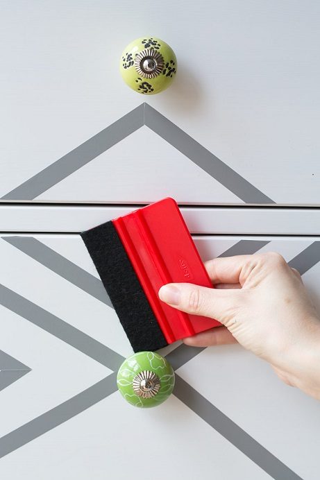 Сделайте шаг назад от своего комода, чтобы оценить общий вид, и как только Вы будете довольны Вашим дизайном, снимите защитную бумагу с клеящейся пленки и закрепите ее на поверхности.