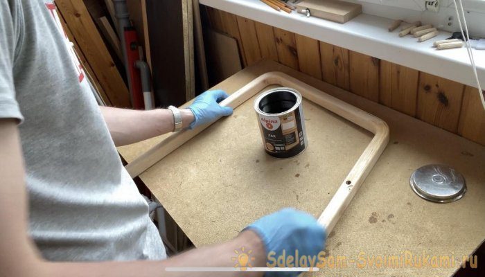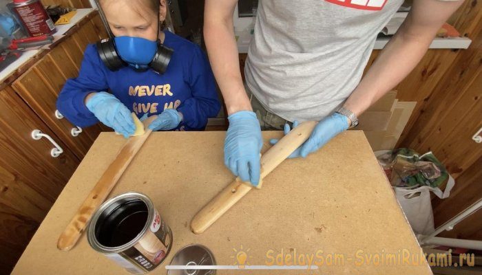 Мне не нравился цвет ножек, поэтому я решила удалить старый лак. Я использовала средство для удаления краски B52. Нанёс его на дерево, подождал около 10 минут и соскреб ножом. После высыхания, отшлифовал наждачной бумагой.