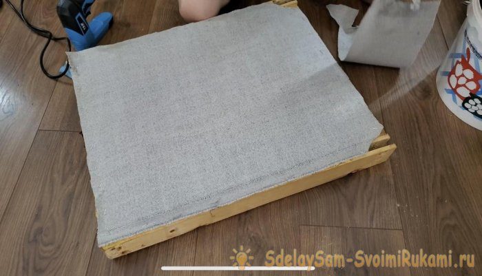 Ткань фиксирую степлером. Очень важна степень натяжки! Она должна быть равномерной, иначе на выходе получатся не симметричные стороны. Углы фиксирую в самом конце. Излишки ткани аккуратно подрезаю ножницами.