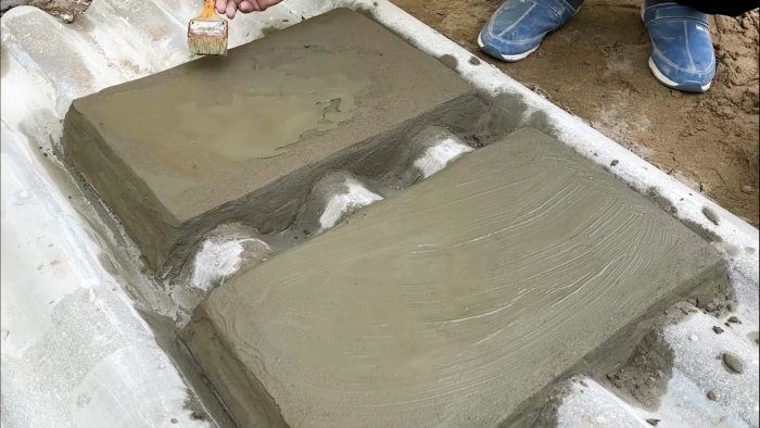 На вымоченную ветошь сверху накладывается бетон, состоящий из цемента и песка, смешанных в равных пропорциях. Нужно сделать густой раствор, чтобы он не растекался. На тканевой подстилке формируем блок будущей стенки, и оставляем сушиться.