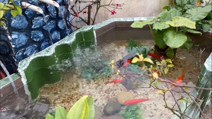 В чашу прудика закладывается аквариумная помпа, а шланг от нее заводится на дно коллектора. Таким образом, при включении прокачки, вода будет подаваться в фильтр, и очищаясь падать сверху. Все это оборудование нужно спрятать под камнями. Для украшения пруда используется пластиковый декор или живые растения.