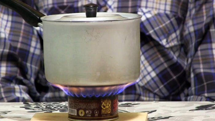 Пламя внутри израсходует весь воздух и сразу же погаснет. Дальше остается только поджечь снаружи пары спирта, выходящие через боковые отверстия. После этого на горелку можно ставить чайник, кастрюлю или другую посуду.