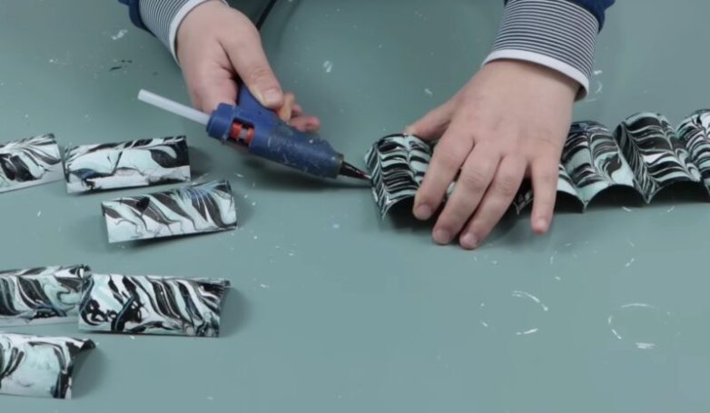 В небольшой емкости распределите краску нескольких оттенков по поверхности воды. С помощью деревянной палочки создайте интересный узор, который придаст втулкам уникальный вид. Осторожно обмакните подготовленные втулки в краску и разместите их на ровной поверхности до полного высыхания.
