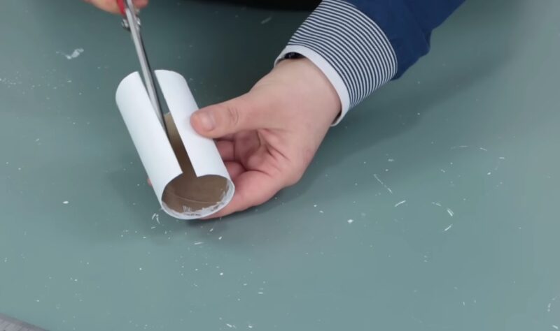 Подготовьте необходимое количество втулок, в зависимости от того, какого размера корзину вы хотите получить. Начните с окрашивания втулок белой акриловой краской. Дайте им полностью высохнуть. Каждую втулку аккуратно разрежьте на две равные части.
