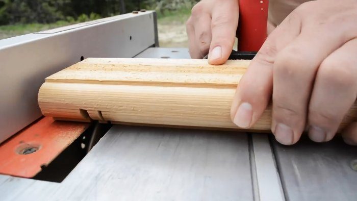 Доски обрабатываем фрезой – одну сторону округляем, с другой стороны делаем паз. Дощечки должны входить друг в друга как стенки бочки, поэтому округленную часть очищаем наждачной бумагой.