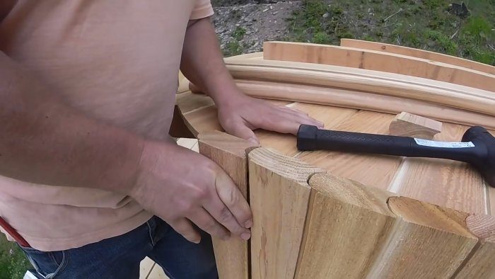 Монтируем стены будущей купели. Вставляем дощечки пазами в пол и стыкуем между собой закругленной частью в паз. Для заделки элементов стены пользуемся резиновым молотком и деревянной подставкой из обрезков.