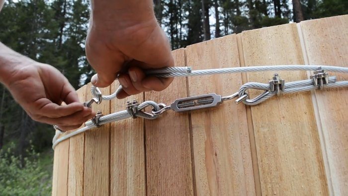 Стягиваем стены образовавшейся купальни с помощью трех тросов с натяжными элементами. Переворачиваем конструкцию и размещаем на помосте.