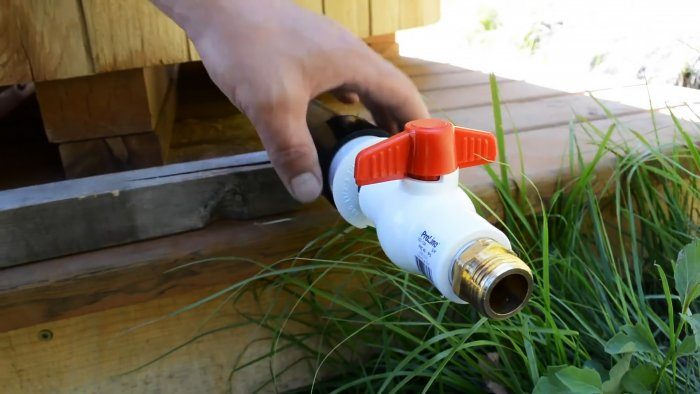 В полу под скамейкой делаем отверстие для сливания воды. Монтируем сливную горловину, а к ней присоединяем водоотводную трубу с шаровым краном. Сливные элементы обрабатываем водонепроницаемым герметиком.