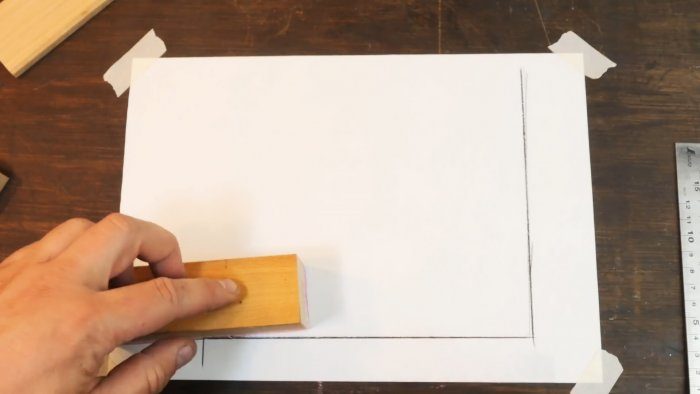 Одну из половин прямоугольного бруса укладываем вдоль вертикальной стороны угла так, чтобы нижний ее край совпал с низом листа и переносим на нее отметки, соответствующие пяти углам. Проводим по отметкам 5 горизонталей и пересекающую их по центру вертикаль.