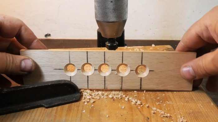 В точках пересечения линий сверлим 5 отверстий с зенковкой.