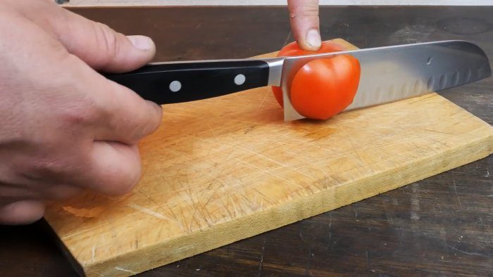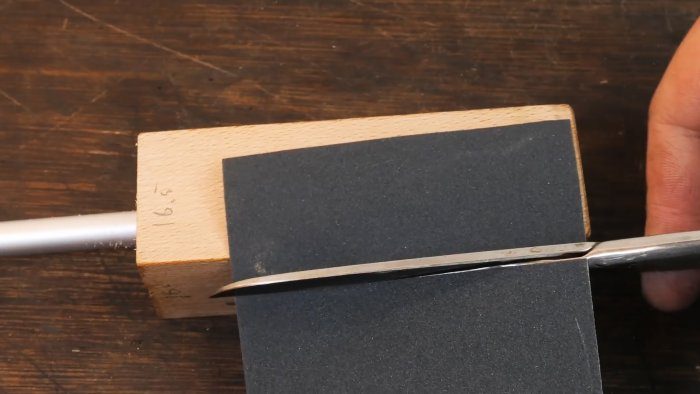 Стержень помещаем в отверстие с нужным углом заточки и начинаем обрабатывать лезвие по всей длине с двух сторон, начиная с наждачки Р240, затем Р400, Р1000, и заканчиваем полировкой. После такой заточки нож только под своим весом с легкостью разрезает помидор.
