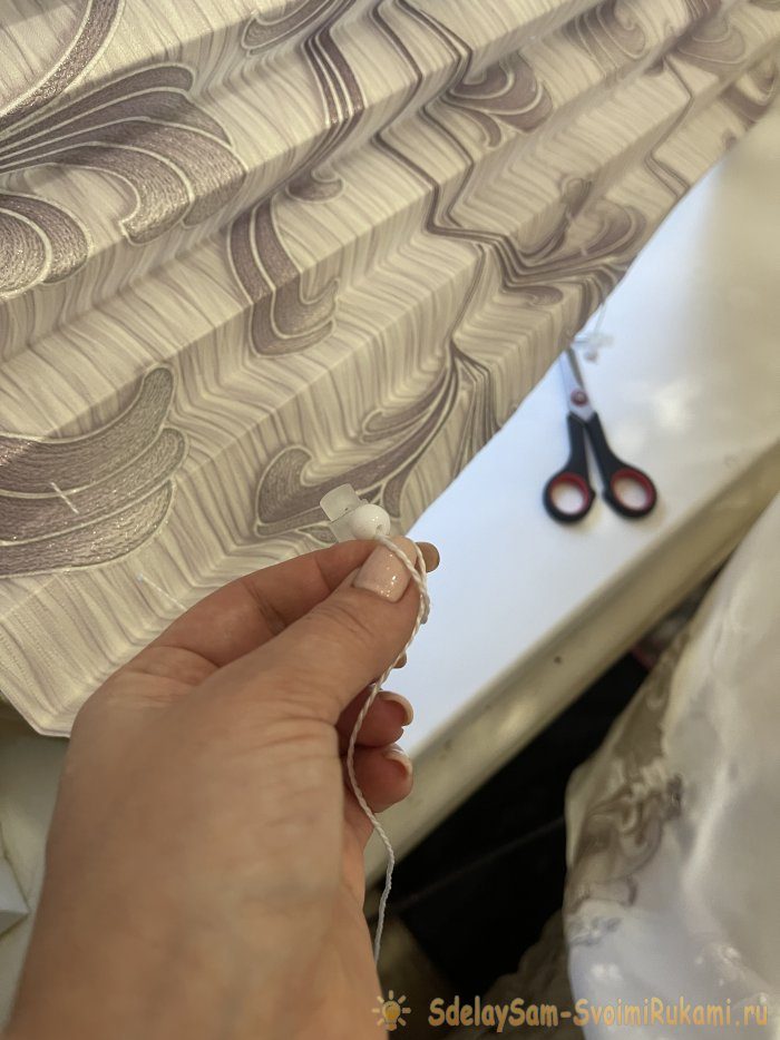 9. Готовые жалюзи прикрепить к окну с помощью двустороннего скотча и уже на месте отрегулировать зажимы, отрезать лишние части шнурков, завязать на них узлы и запаять концы зажигалкой.