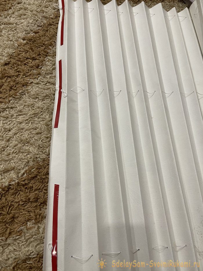 4. Получившуюся конструкцию положить на твердую поверхность и при помощи дрели, шила или дырокола проделать в ней отверстия, отступая по 2-3 см от краев. Дополнительно, если обои очень плотные или окно слишком широкое, можно сделать отверстие ровно посередине гармошки.