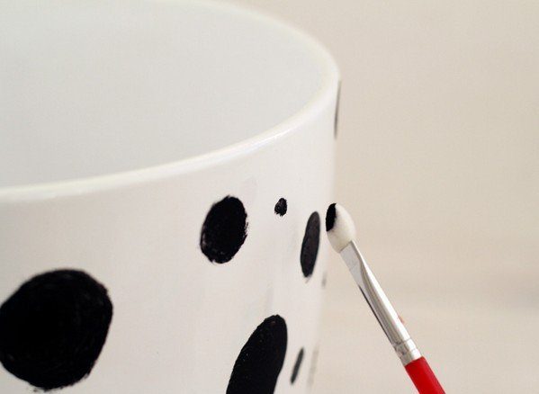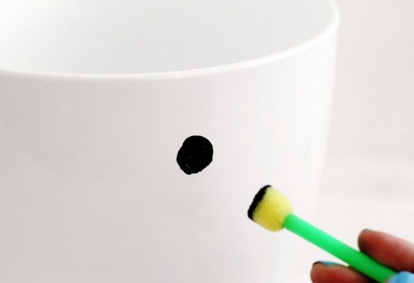 5. Возьмите малярную кисточку и сделайте маленькие черные точки на поверхности между теми, что нанесли губкой. Используйте ту же технику, перемещаясь по поверхности горшка, чтобы создать нерегулярные пятна.