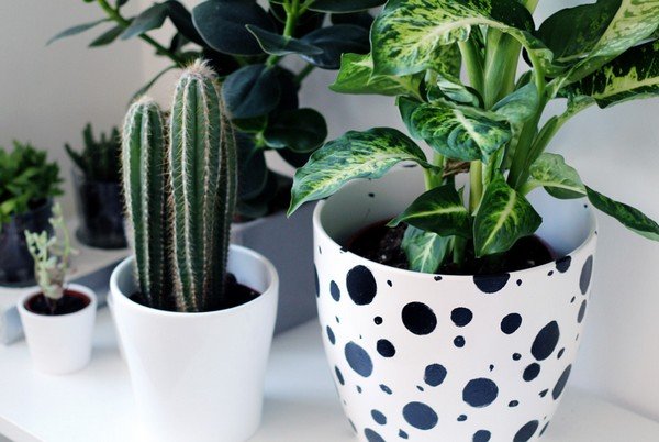 К тому же растения и цветочные горшки отличная возможность для воплощения творческих идей и современного дизайна. Если в комнате присутствуют принты в стиле далматина, например, на шторах, обоях или текстиле, то можно продолжить эту тему и на цветочных горшках. К тому же монохромный, черно-белый дизайн сейчас очень популярен.