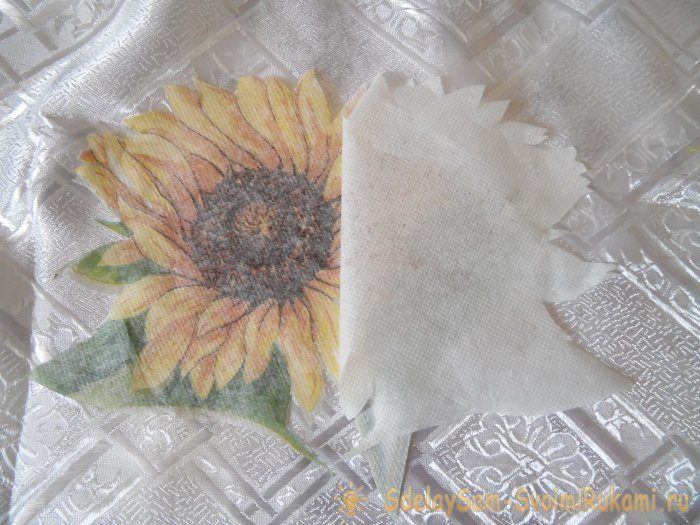 Снимите белые слои. Салфетки бывают двух- и трехслойными, у вас должен остаться только самый верхний, тоненький рисунок.