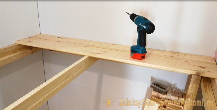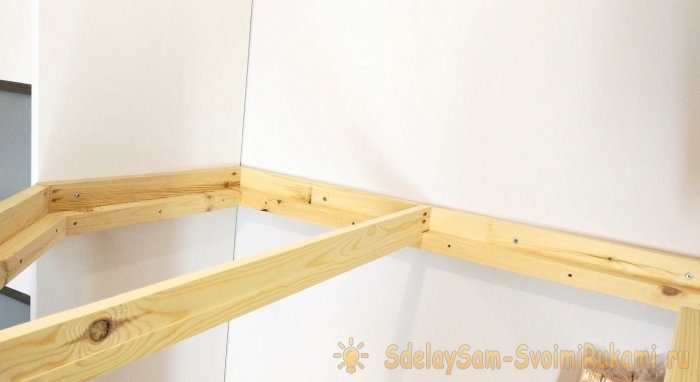 Под домиком я сделал 3 полки для хранения игрушек. Использовал доску 90*20*1500мм и уголки. Уголки такие же, как и для ступеней, но я покрасил их в белый цвет.