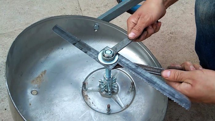 После этого на шпильке между двумя гайками и шайбами зажимается 2 ножа. Их можно вырезать из обломка ленточной пилы или полотна ручной ножовки. В месте зажатия на ножах требуется сделать выборку под шпильку, чтобы они прижались к ней плотнее.