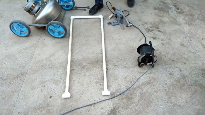 С любой стороны косилки нужно просверлить уголки с краю, и вставить между ними длинную шпильку. Она послужит основанием для крепления руля. Сам руль изготавливается П-образным из 3-х отрезков полипропиленовой трубы. Они спаиваются между собой с помощью 2-х колен. Снизу на руль паяются тройники.