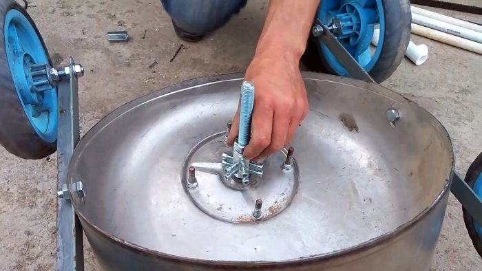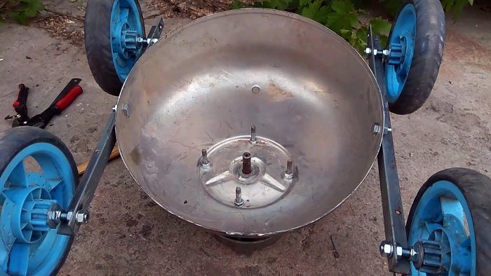 К боковым отверстиям на нижней части дна бака или бочки прикручивается по уголку. По краям уголков делается по отверстию для установки колес на болты. Уголки с колесами зажимаются на базе косилки из бака от стиральной машины с уклоном, чтобы скошенное дно выровнялось в горизонт.