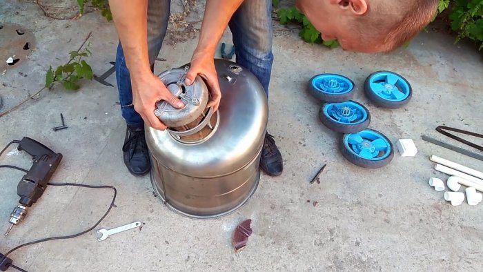 Затем на боковых стенках ближе ко дну делается 2 отверстия напротив. Они понадобятся для дальнейшего крепления осей с колесами. Для этого нужно визуально разделить бак или бочку поперек на 2 равные части, чтобы отверстия были симметричными. Затем дно вместе с частью стенок отрезается.