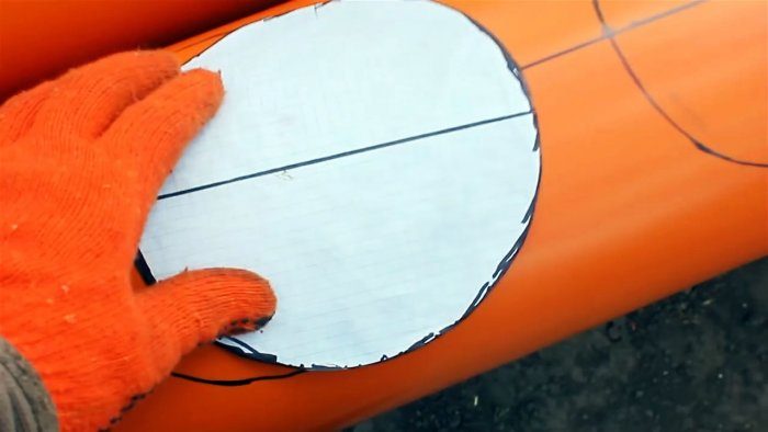 После этого берется заглушка 200 мм, в ней проделывается ближе к краю отверстие под раструб трубки 40 мм.
