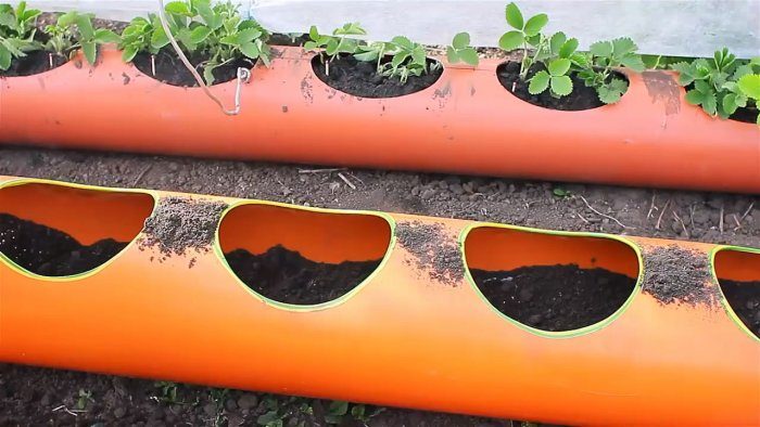 При отсутствии достаточной площади на участке под организацию грядок для выращивания клубники можно схитрить и высадить ее в канализационную трубу с прорезанными окнами. Такой метод позволяет облегчить полив, прополку сорняков, а кроме этого размещать грядки где угодно, даже подвешивать на фасад здания, стены беседки, забор и т.д.