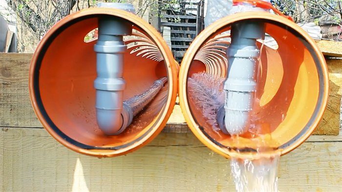 С другой стороны на трубку полива ставится соединительная муфта, колено, обычная муфта и переходник на 50 мм. При этом в стенке раструба оранжевой трубы делается небольшое отверстие для вывода переходника. Затем следует заглушить трубу 200 мм второй крышкой.