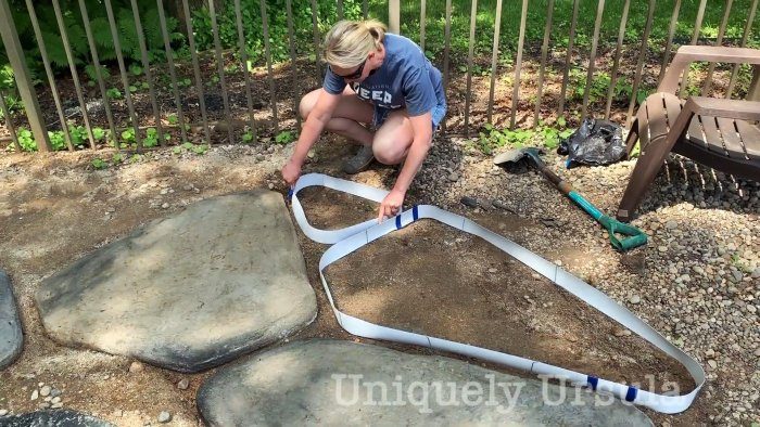 Чтобы сымтировать плоские булыжники, нужно подготовить форму. Она делается под каждый камень отдельно из гибкой, но достаточно жесткой ленты. Ширина ленты должна быть минимум 5-6 см. В ее качестве подойдут полосы от старых оконных жалюзи. Можно просто порезать на ленты обрезки линолеума и другого подобного материала. Края полос соединяются в кольца степлером или склеиваются скотчем, изолентой. Кольца делаются неправильной формы разных размеров, и выкладываются на подготовленную поверхность с зазором 5-10 см.