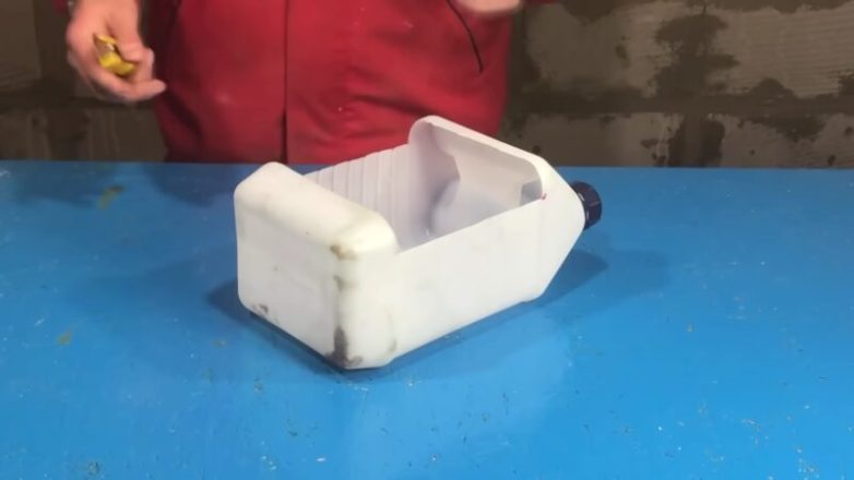 Срежьте верхнюю часть пластиковой канистры, это позволит создать основу для будущего органайзера. Следующим шагом зашлифуйте края, чтобы избавиться от острых углов и неровностей.