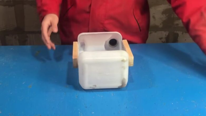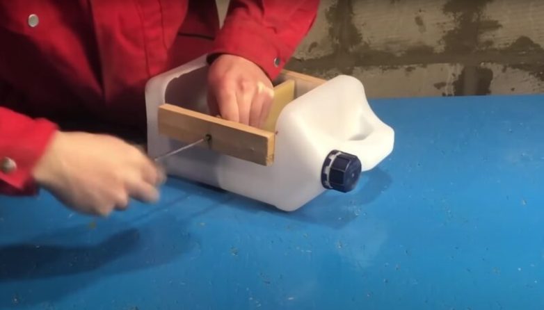 Закрепите две направляющие по бокам канистры. Можно использовать деревянные или пластиковые рейки, которые легко прикрепляются с помощью клея или саморезов.