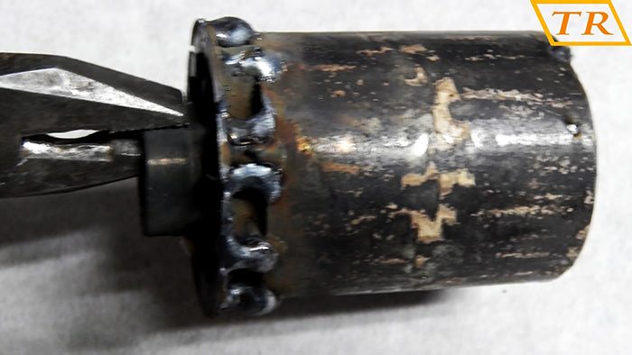 После этого устанавливаем ее зубьями внутрь стальной трубы с внешним диаметром 50 мм и надежно завариваем.