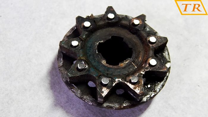 Разрезаем болгаркой заклепки и удаляем защитную боковую крышку-диск.