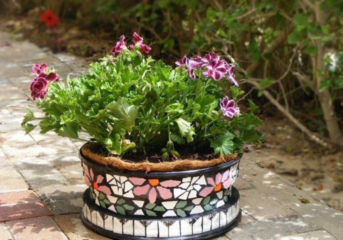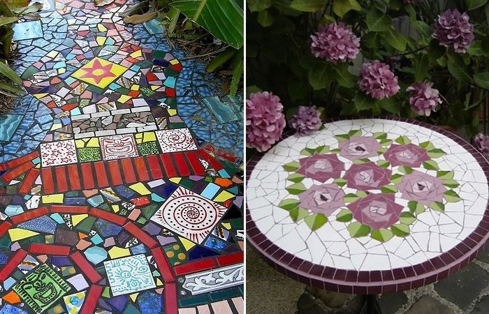 Таким же способом можно украсить любую мебель, особенно эффектно будут выглядеть садовые скамейки.
