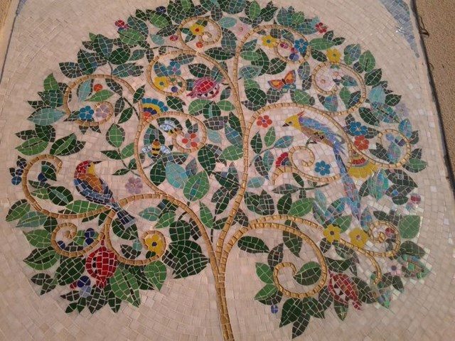 Для изготовления панно можно использовать даже осколки посуды или сочетание ее с частичками плитки. Для начала нужно разработать проект и создать цветовую гамму. Плитки можно окрасить специальными красками по стеклу или керамике после укладки и обязательно защитить слоем лака.
