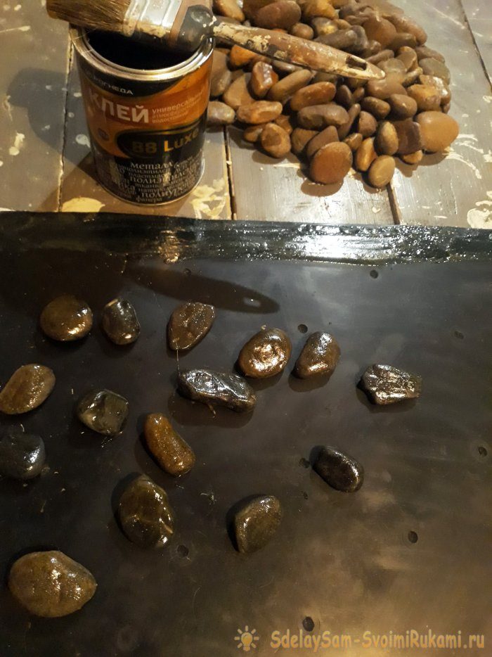 4 этап. Подетально смазывайте клеем коврик и камни, оставляйте минуты на 2-3, затем плотно прижимайте клеевой стороной камни к коврику.