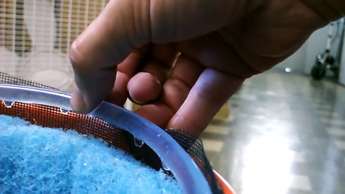 После этого изнутри ведра закрепляется фильтрующий коврик и в крышку устанавливается вентилятор, выдувом наружу. Таким образом, всасываемый в фильтр поток будет оставлять пыль на коврике, и наружу сможет выходить чистый воздух.