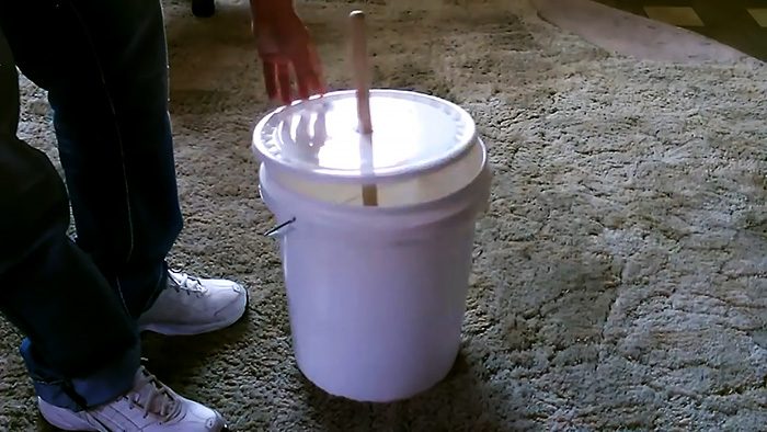 Ведро закрывается крышкой с врезанным вентилятором. Тот должен выдувать воздух наружу.