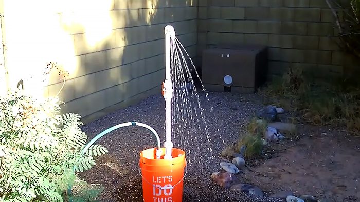 Сверху ведра сбоку врезается 2 гусака сделанных из ПВХ труб и колен. Для разбрызгивания воды они закрываются заглушками с перфорацией. Один излив подключается шлангом к аквариумной помпе. Та в свою очередь укладывается на дно ведра, куда нужно будет залить воду. Второй излив оснащается выходом наружу для подключения к внешнему источнику воды.