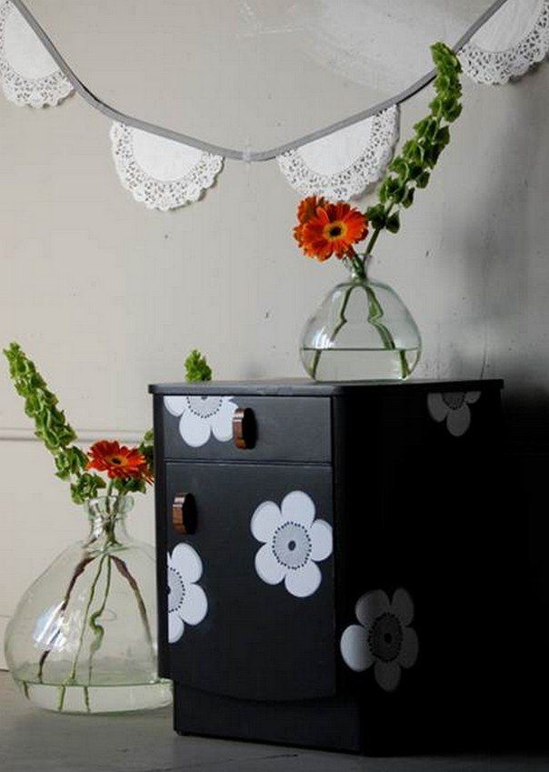 2. Спланируйте тщательно дизайн. Вырежьте те части, которые хотите включить в проект. В нашем случае это будут белые цветы на черном фоне, они будут особенно хорошо сочетаться. Продумайте, куда Вы их наклеите и сколько, чтобы мебель смотрелась гармонично. Цветы довольно крупные и их не должно быть много.